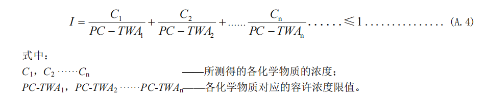 A.3.2.2 當(dāng)兩種或兩種以上有毒物質(zhì)共同作用于同一器官、系統(tǒng)或具有相似的毒性作用,或已知這些 物質(zhì)可產(chǎn)生相加作用時,應(yīng)按公式(A.4)計算混合接觸比值(I)。當(dāng)I≤1時,表示未超過OELs,符合 衛(wèi)生要求;反之,當(dāng)I>1時,表示超過OELs,則不符合衛(wèi)生要求。