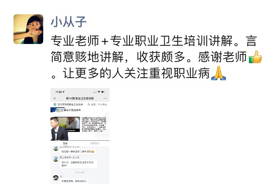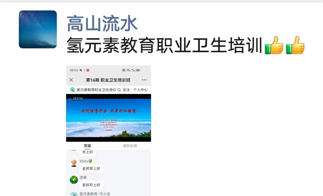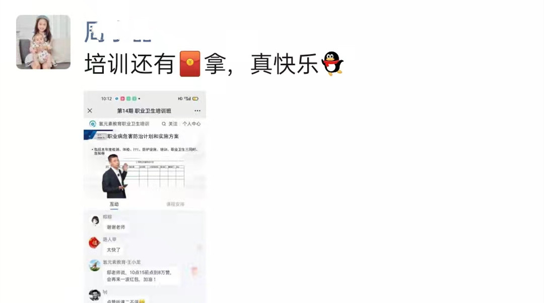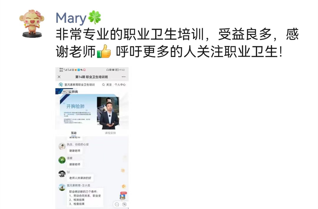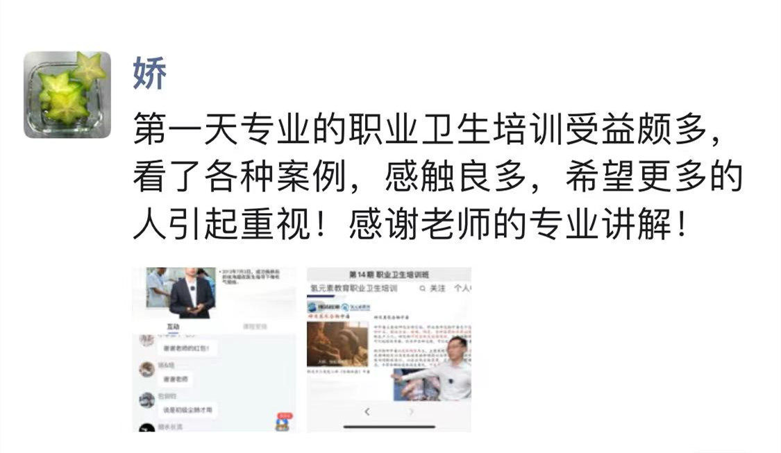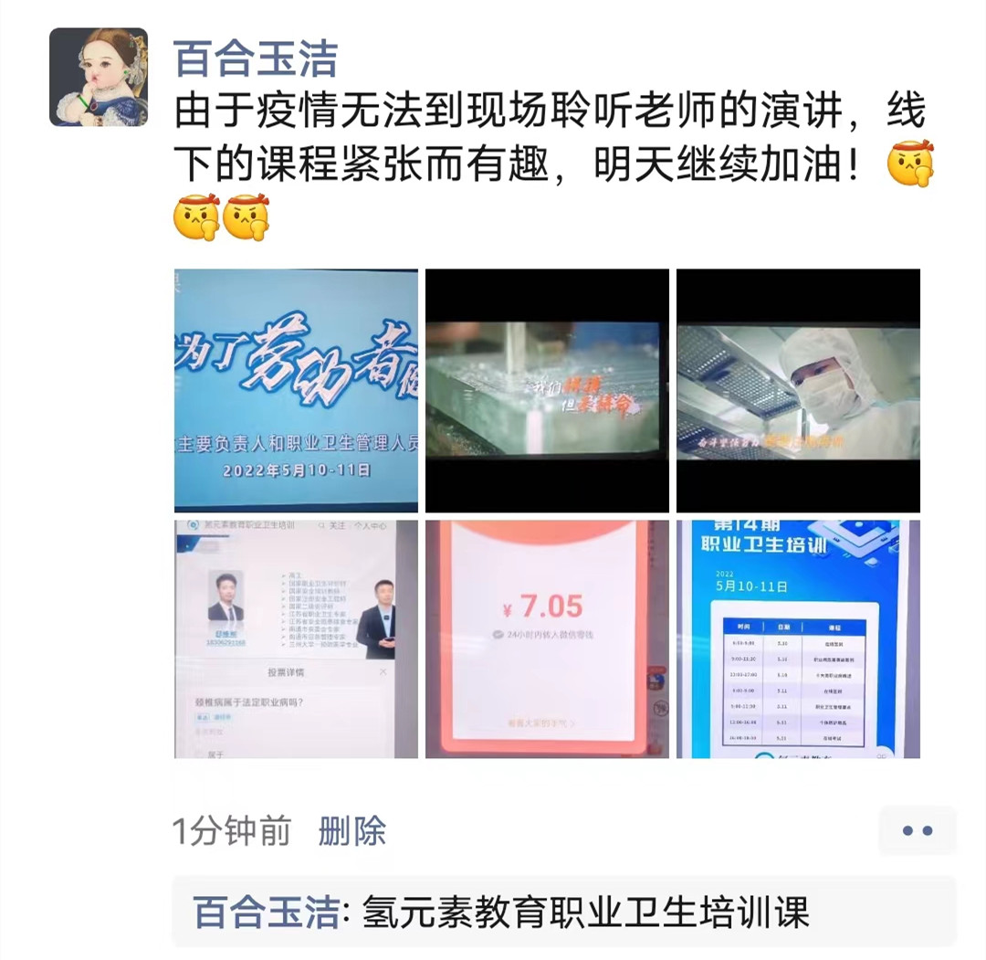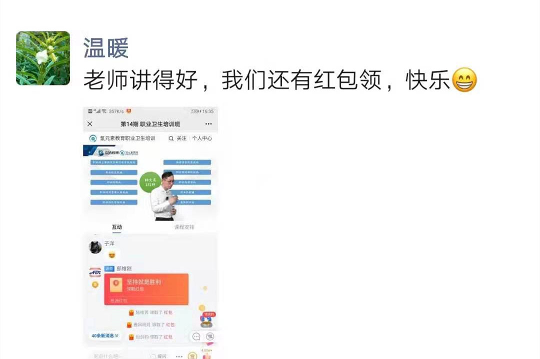 學(xué)員都是這樣說的:“隔著屏幕居然有這么好的上課氣氛”“非常專業(yè)的職業(yè)衛(wèi)生培訓(xùn),受益良多!”“上課內(nèi)容有趣易懂,上了一天的課,搶了一天的紅包,晚上敢緊給自己安排了一頓小龍蝦。””參加氫元素線上培訓(xùn),一邊學(xué)知識,一邊搶紅包”……
