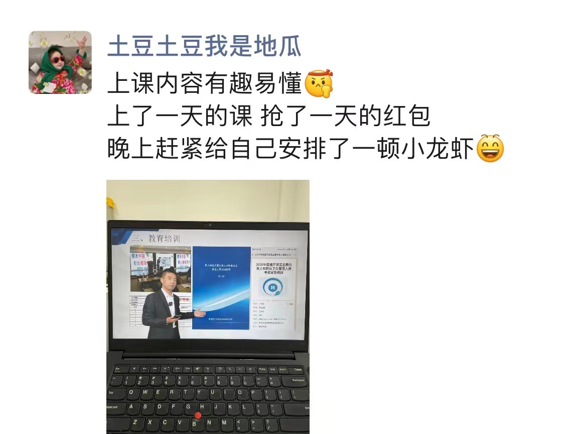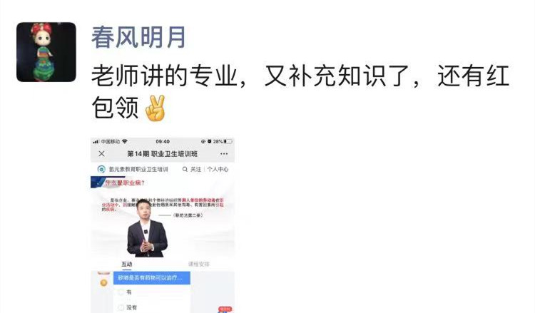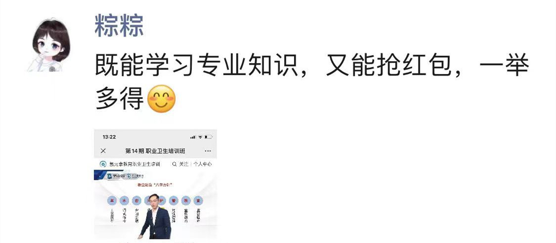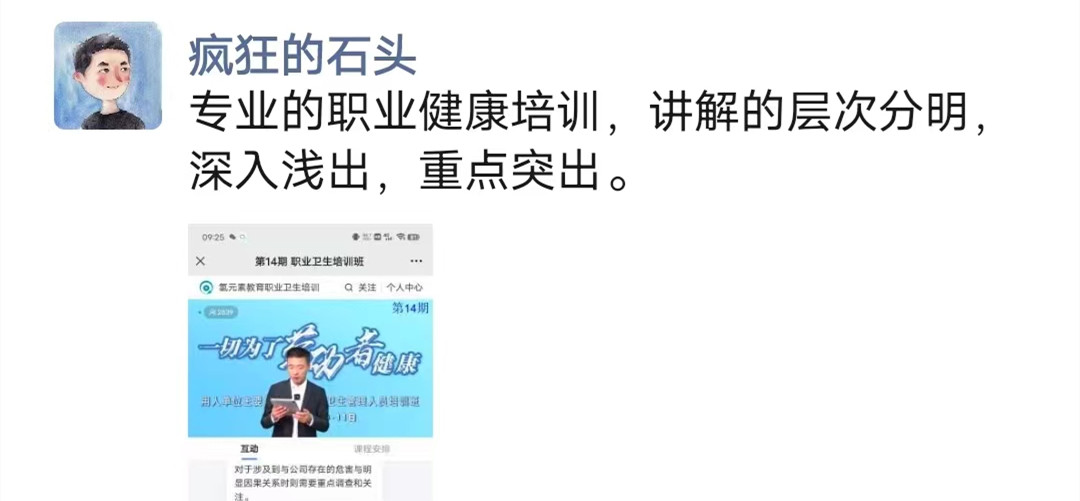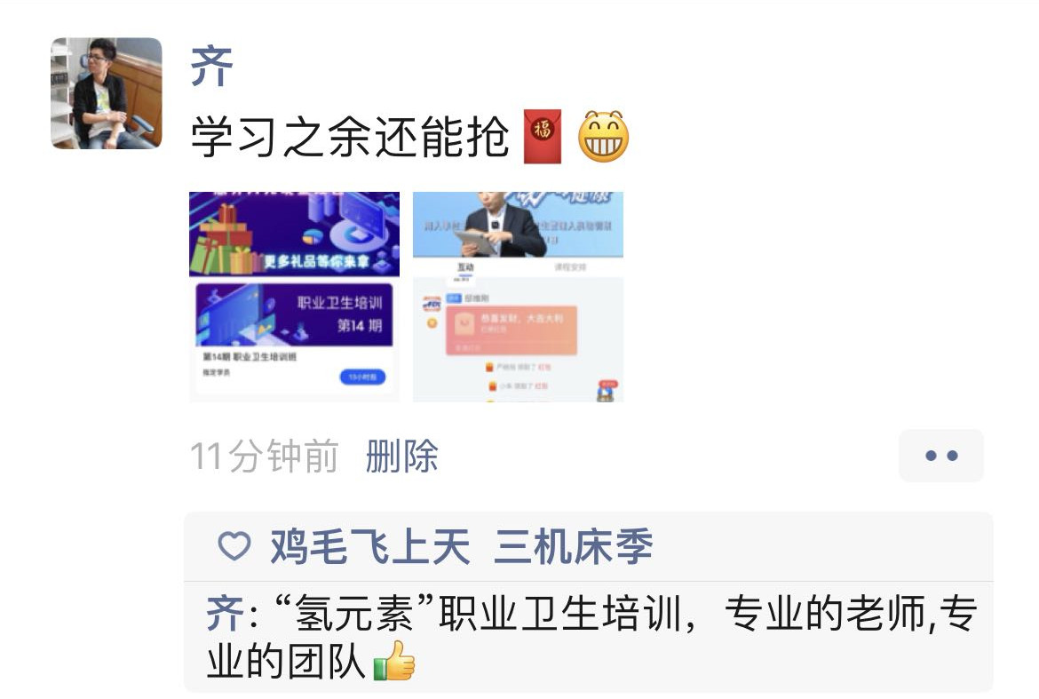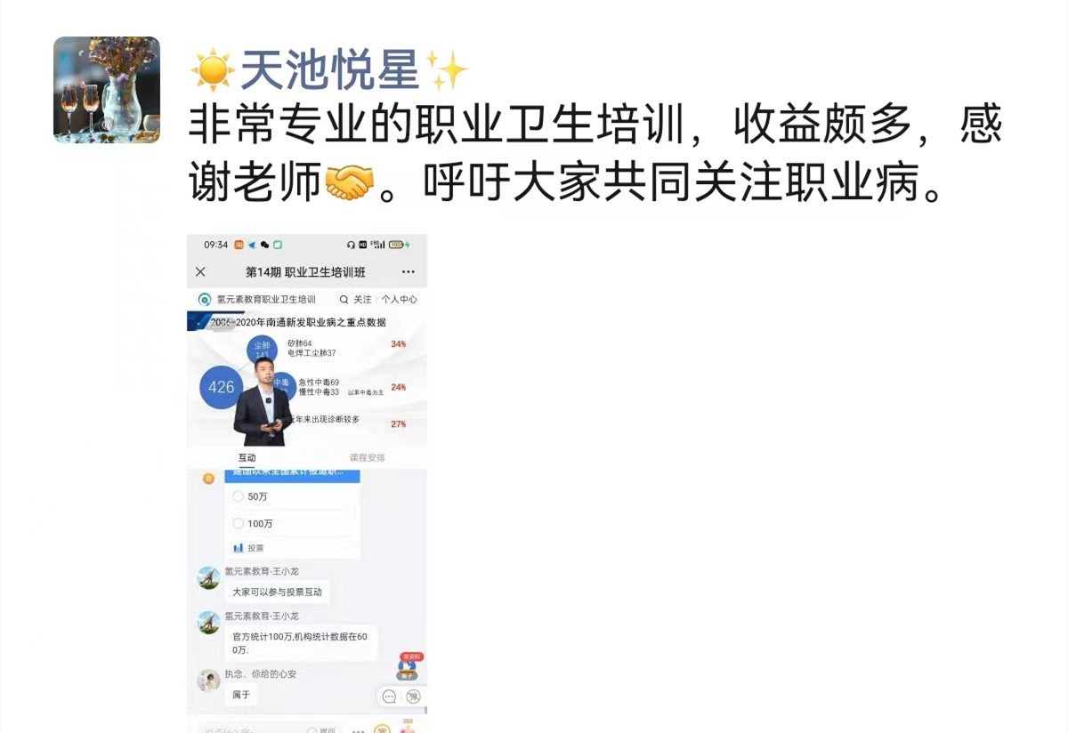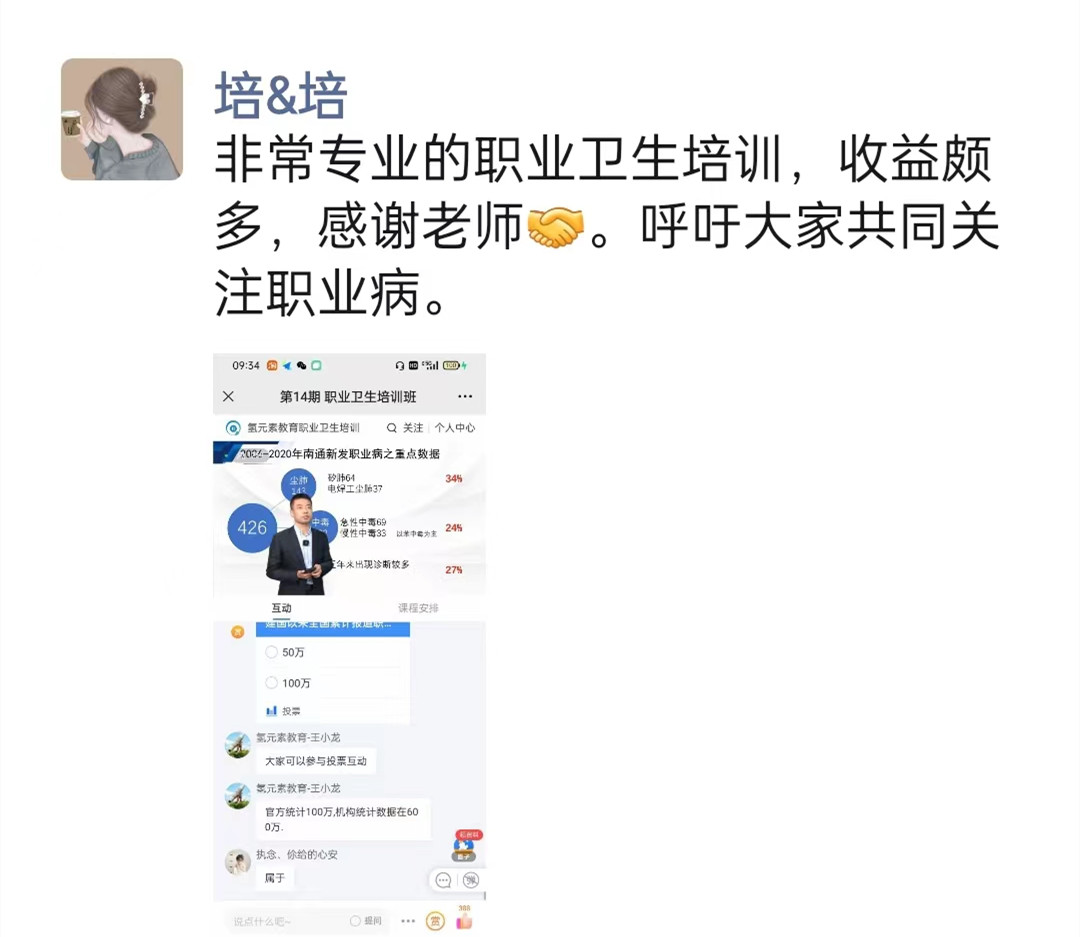 學(xué)員都是這樣說的:“隔著屏幕居然有這么好的上課氣氛”“非常專業(yè)的職業(yè)衛(wèi)生培訓(xùn),受益良多!”“上課內(nèi)容有趣易懂,上了一天的課,搶了一天的紅包,晚上敢緊給自己安排了一頓小龍蝦。””參加氫元素線上培訓(xùn),一邊學(xué)知識,一邊搶紅包”……