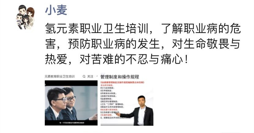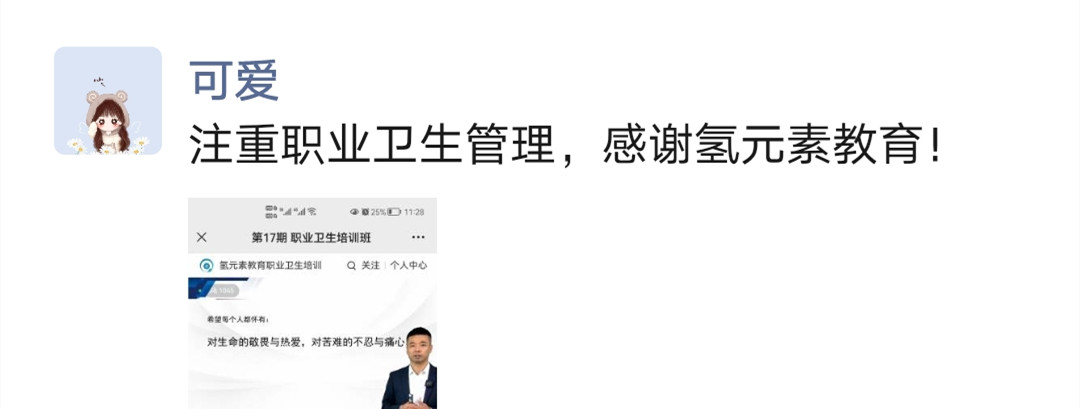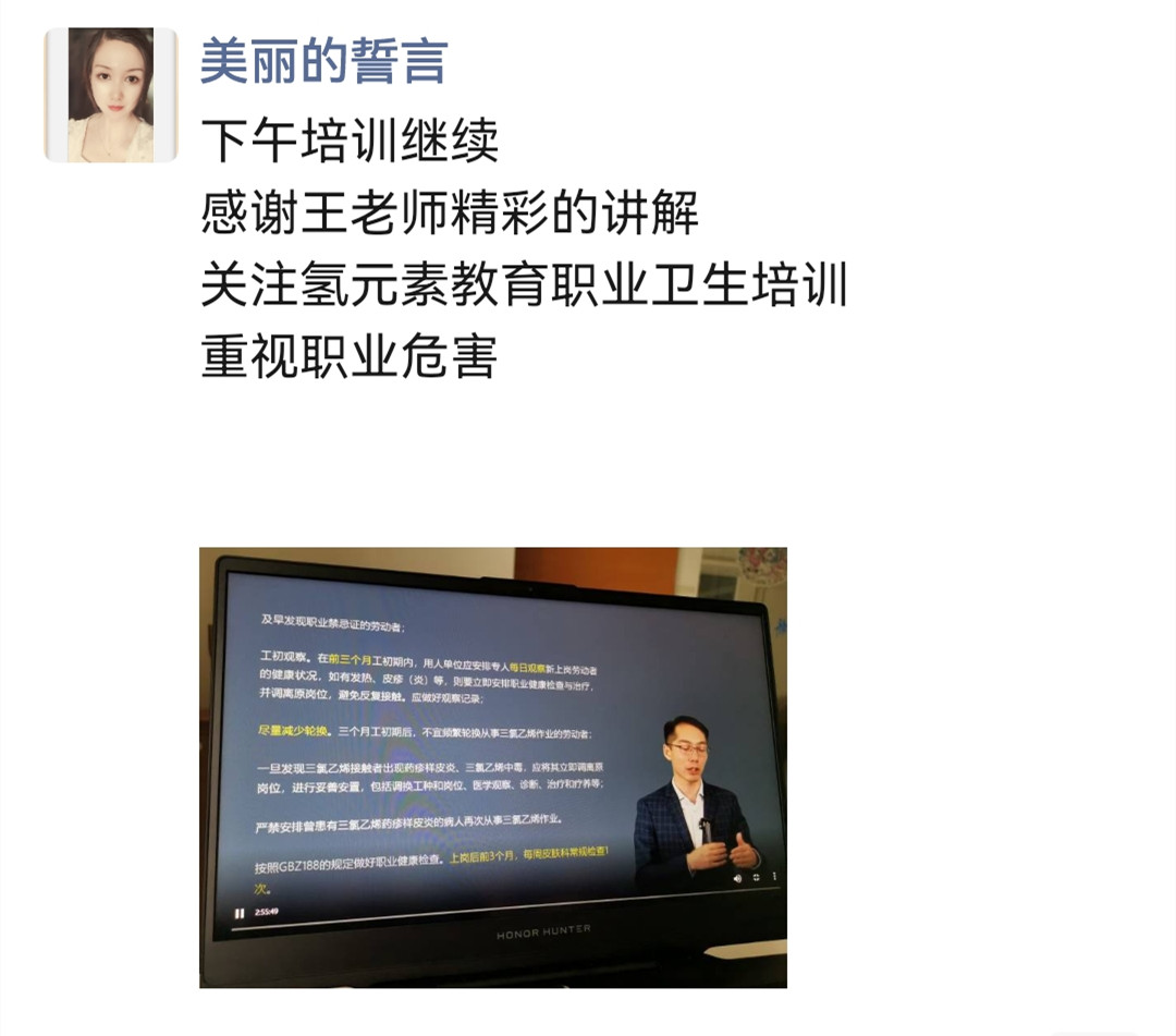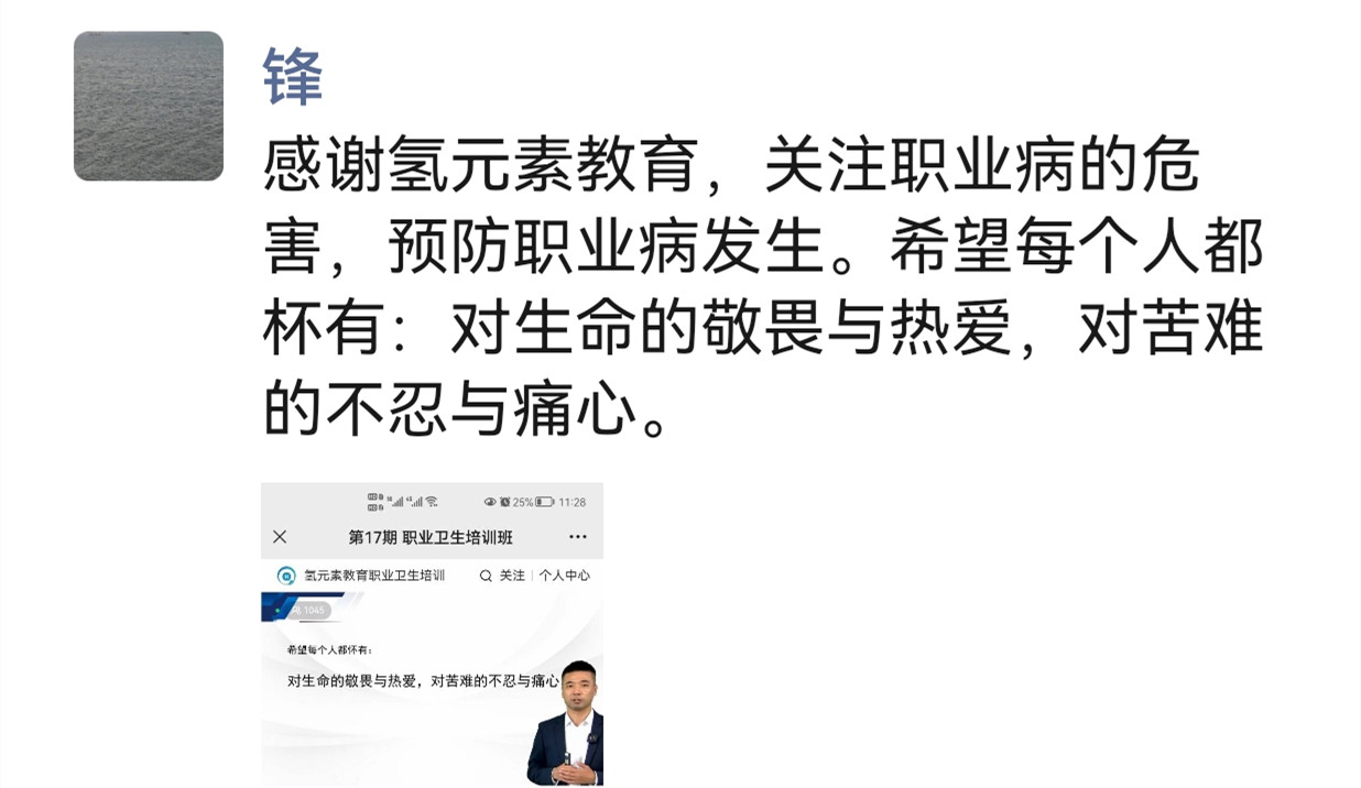 有個(gè)學(xué)員這樣說(shuō):“感謝氫元素教育,關(guān)注職業(yè)病的危害,預(yù)防職業(yè)病的發(fā)生。希望每個(gè)人都懷有:對(duì)生命的敬畏與熱愛(ài),對(duì)苦難的不忍與痛心?!?/p>
