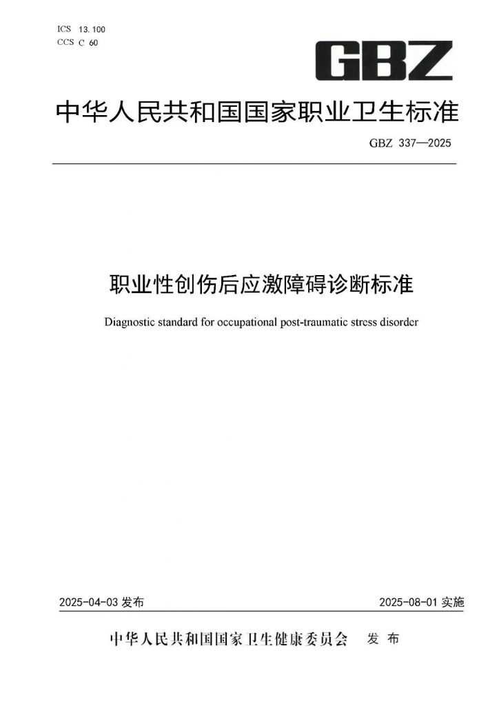 2024年12月,國家衛(wèi)生健康委與人力資源社會(huì)保障部等4部門聯(lián)合印發(fā)新版《職業(yè)病分類和目錄》,新增2個(gè)職業(yè)病類別和2種具體職業(yè)病,其中,職業(yè)性精神和行為障礙類別中新增創(chuàng)傷后應(yīng)激障礙(限于參與突發(fā)事件處置的人民警察、醫(yī)療衛(wèi)生人員、消防救援等應(yīng)急救援人員)。為實(shí)現(xiàn)對(duì)職業(yè)性創(chuàng)傷后應(yīng)激障礙的規(guī)范診斷,制定《職業(yè)性創(chuàng)傷后應(yīng)激障礙診斷標(biāo)準(zhǔn)》。