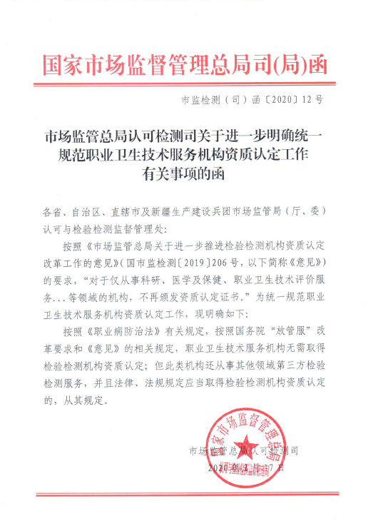 2020年2月,國家市場監(jiān)督管理局下發(fā)了《市場監(jiān)督總局認(rèn)可檢測司關(guān)于進(jìn)一步明確統(tǒng)一規(guī)范職業(yè)衛(wèi)生技術(shù)服務(wù)機(jī)構(gòu)資質(zhì)認(rèn)定工作有關(guān)事項(xiàng)的函》(市監(jiān)檢測(司)函【2020】12號)。在此函中正式通知并且明確了按照《職業(yè)病防治法》和國務(wù)院“放管服改革要求,職業(yè)衛(wèi)生技術(shù)服務(wù)機(jī)構(gòu)無需再取得檢驗(yàn)檢測機(jī)構(gòu)資質(zhì)認(rèn)定”,這是對以上資質(zhì)認(rèn)定改革工作意見精神的具體落實(shí)。